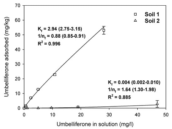Umbelliferone adsorption isotherms on the two soils selected for the study. Symbols represent experimental data points, whereas lines are the Freundlich-fit adsorption isotherms. The Freundlich coefficients for each isotherm are indicated in the graph.