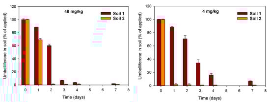 Figure 3 shows the dissipation patterns of umbelliferone in soils 1 and 2 after its application to the soils at two different initial concentrations of 40 and 4 mg/kg. Umbelliferone dissipated faster in soil 2 (t1/2 = 0.2–0.8 days) than in soil 1 (t1/2 = 1.5–2.1 days) at the two initial concentrations tested, but differences were particularly pronounced at the lower concentration of 4 mg/kg. This was because the effect of the initial concentration on the dissipation rate of umbelliferone was soil-dependent. A decrease in the application rate reduced the persistence of umbelliferone in soil 2, whereas it increased its persistence in soil 1 (Figure 3).