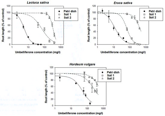 Dose-response curves for the inhibitory effect of umbelliferone on the root growth of L. sativa, E. sativa, and H. vulgare under Petri dish conditions and in the presence of two soils (t = 6 days).