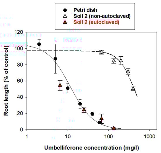 Dose-response curves for the inhibitory effect of umbelliferone on the root growth of E. sativa under Petri dish conditions and in the presence of non-autoclaved and autoclaved soil 2 (t = 6 days).
