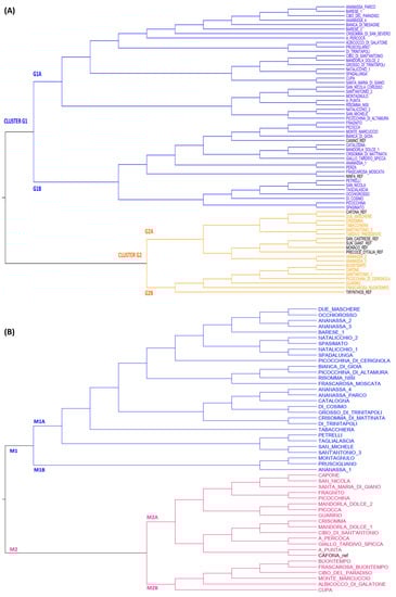 The phylogenetic tree divided the Apulian apricot collection into two main clusters (Figure 1A): cluster G1, the largest one, which contains most of the analyzed genotypes (46), and cluster G2, which includes the remaining genotypes (19). Both clusters were further divided into two sub-groups each, named G1A, G1B and G2A, G2B. The clusterization of some reference cultivars was in line with the results of other research, which confirmed the high genetic distance between “Canino” and “Tirynthos” [27] and the close genetic relation between “San_Castrese” and “Cafona” [53].