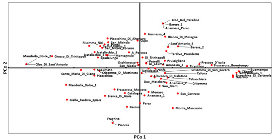 The principal coordinate analysis (PCoA) was not as informative as expected because no well-defined clusters were clearly identified. However, the genetic distance for the reference cultivars and most cultivars with LRM values of 0.5 was respected. A slight discrepancy with the LRM results and the phylogenetic clustering was observed in some cases, such as those for the couples “Natalicchio_2” and “San_Michele”, “Petrelli” and “San_Nicola”, “Picocchina” and “Spasimato”, and “Cafona” and “Due_maschere” that did not perfectly overlap in the PCoA plot (Figure 2).