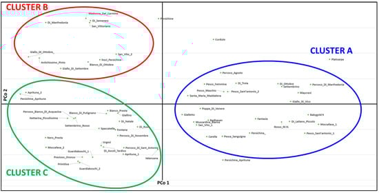 The PCoA plot was consistent with the genetic clustering tree, confirming the allelic similarity of the cultivars with high LRM values and the resolution of wrong homonymous cases. The first two components explained 16.63% of the total genetic variation (9.04 and 7.59%, respectively). According to that, the cultivars were divided into three main groups: A, B and C (Figure 5). In detail, cluster A mostly corresponded to cluster G2 of the phylogenetic tree, while clusters B and C contained genotypes that were included in cluster G1. Only four genotypes (“Persichine”, “Persichina_Aprituna”, “Curdulo” and the reference “Platicarpa”) were excluded from the PCoA clusters, thus highlighting their high genetic diversity with respect to the entire peach collection.
