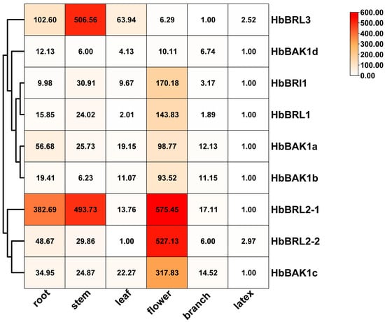 2.5. Expression Analysis of HbBRI1 and HbBAK1 Genes in Different Tissues