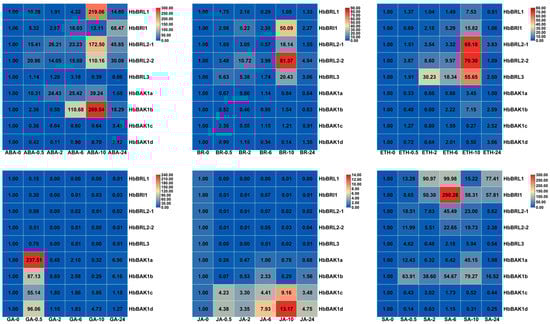 2.6. Expression Profile of HbBRI1 and HbBAK1 Response to Hormone Stress