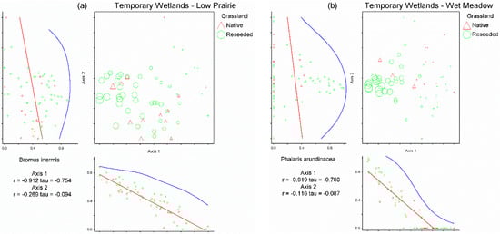 Bromus inermis relative abundance was determined to be the most influential driver determining site position in species space along Axis 1 of the low prairie ordination as B. inermis possessed the strongest correlation (r = −0.91) and was the only species significantly negatively correlated with Axis 1 (Table 2). Bromus inermis was present as a primary species in 54 of 59 temporary wetlands’ low prairie zones, often comprising 50–100% of relative cover, especially in reseeded grasslands (Figure 1a). The species correlated with Axes 2 and 3 of the NMS ordination (Table 2) did not appear to indicate clear drivers of the temporary wetland low prairie plant communities due to the weaker strength of the correlations and less variance explained by NMS Axes 2 and 3.