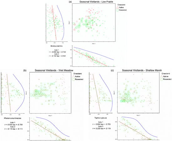Non-metric multi-dimensional scaling ordinations for the low prairie vegetation zone (a), wet meadow vegetation zone (b), and shallow marsh vegetation zone (c) of 141 seasonal wetlands. Each triangle represents a seasonal wetland located on native grassland and each circle represents a seasonal wetland located on reseeded grassland. The relative size of site symbols (triangles/circles) indicates the relative cover of Bromus inermis in the low prairie zone (a), Phalaris arundinacea in the wet meadow zone (b), and Typha ×glauca in the shallow marsh zone (c). Species’ correlations with each axis are included beneath the horizontal axis and to the left of the vertical axis (i.e., B. inermis in the low prairie vegetation zone (a), P. arundinacea in the wet meadow vegetation zone (b), T. ×glauca in the shallow marsh zone (c)).