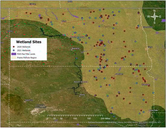 The Prairie Pothole Region (PPR) includes >770,000 km2 through the north–central United States and portions of central Canada [1,2]. This formerly glaciated area is famous for millions of “prairie pothole” wetlands [3]. The PPR experiences variable temperatures, precipitation, evapotranspiration rates, topography, and land-uses across latitudinal and longitudinal gradients [1,4,5]. A substantial portion of prairie potholes has been lost to anthropogenic disturbance (i.e., conversion to agricultural land use), but >2.6 million remain, comprising roughly 26,000 km2 [6].