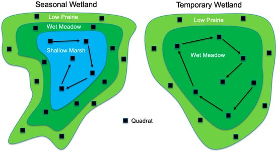 Example quadrat layouts by vegetation zone for seasonal and temporary wetlands following DeKeyser et al. [15] and Hargiss et al. [16]. Quadrats (1 m2) in the exterior zones (low prairie and/or wet meadow zones) were placed near the center of the zone, with random but relatively even spacing around the wetland. Quadrats within the interior zone (shallow marsh for seasonal wetlands and wet meadow for temporary wetlands) were placed starting at the outer edge of the zone and progressing in a spiral fashion toward the center of the wetland.