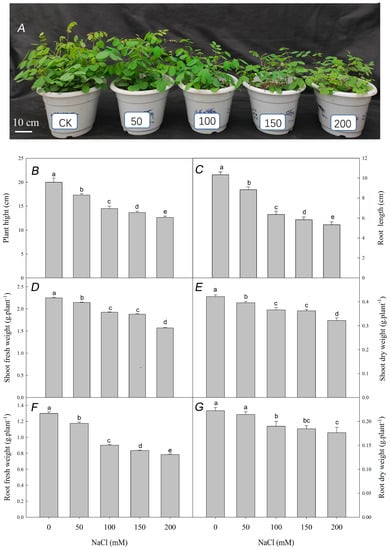 Effect of NaCl stress on the growth of R. pseudoacacia seedlings. (A) Seedlings under different NaCl concentrations (0 mM, 50 mM, 100 mM, 150 mM, 200 mM); (B) plant height; (C) root length; (D) shoot fresh weight; (E) shoot dry weight; (F) root fresh weight; (G) root dry weight. Values are mean ± SD of five biological replicates. Bars with different letters are significantly different at p < 0.05 according to Duncan’s multiple range tests.