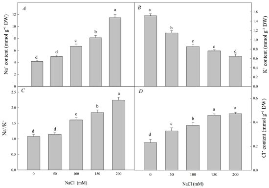 Effect of NaCl stress on Na+, K+, Cl−, and Na+/K+ ratio and of R. pseudoacacia seedlings. (A) Na+ content; (B) K+ content; (C) Na+/K+; (D) Cl− content. Values are mean ± SD of five biological replicates. Bars with different letters are significantly different at p < 0.05 according to Duncan’s multiple range tests.