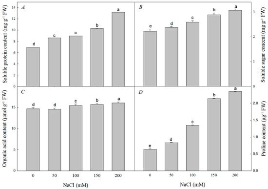 Compared with the control values, soluble protein, soluble sugar, and proline contents significantly increased with increasing NaCl concentration (Figure 3). Organic acid content showed no significant difference at 50 mM NaCl compared to the control, but rose at higher salt concentrations (100 mM, 150 mM, 200 mM). The increase in proline content was significantly greater than the increases for other osmotic regulators. At 50 mM, 100 mM, 150 mM, and 200 mM treatments, the proline contents were 1.31 times, 2.17 times, 3.36 times, and 3.68 times those of the control, respectively.