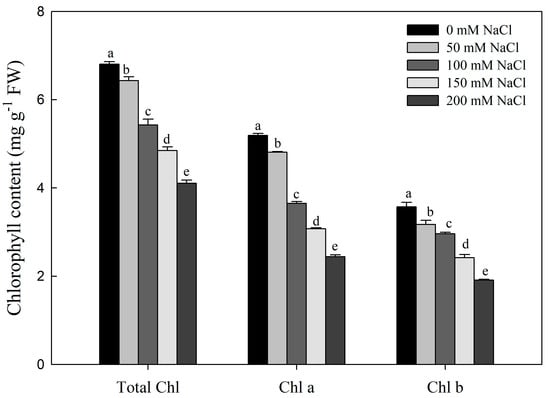 With increasing salt concentrations, total chlorophyll, chlorophyll a, and chlorophyll b contents significantly decreased compared to the control (Figure 7). At 200 mM NaCl, the total chlorophyll, chlorophyll a, and chlorophyll b contents were 55.2%, 47.1%, and 48.7% of the control group abundances, respectively.