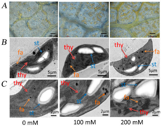 Effect of NaCl stress on the grease content (A) and chloroplast structure (B,C) of R. pseudoacacia seedlings. thy: thylakoid; st: starch granule; fa: liposphere. Bars in (A) are 10 µm; bars in (B) are 5 µm; bars in (C) are 2 µm.