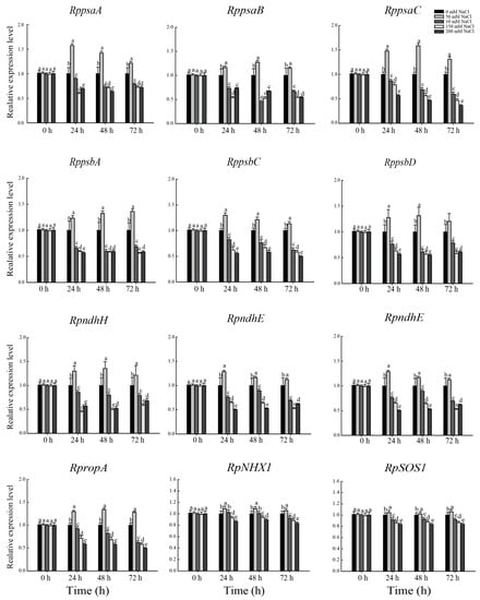 Effect of NaCl stress on the expression of key genes in chloroplast development (RppsaA, RppsaB, RppsaC, RppsbA, RppsbC, RppsbD, RpndhE, RpndhH, Rprps7, and RpropA) and ion transporters (RpNHX1 and RpSOS1) of R. pseudoacacia seedlings. Values are mean ± SD of five biological replicates. Bars with different letters are significantly different at p < 0.05 according to Duncan’s multiple range tests.
