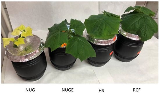 Cucumber seedlings displayed visible changes in the growth rate after the first days of growth in the NUG medium. NUG-cultivated plants showed strongly reduced growth when compared to NUGE-, HS-, and RCF-cultivated plants. After ten days of following NUG cultivation, the growth of the plants was completely inhibited, and the plants were characterized by strong chlorosis on the leaves (Figure 1), whereas after the next few days, leaf withering was observed. Consequently, the cultivation of the NUG plants ended around the 20th day of growth during the experiment. At the same time, no similar symptoms were observed in other plants nourished with NUGE, HS, and RCF media.