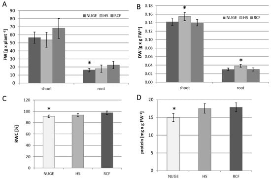 The different parameters of NUGE—, HS—, and RCF—nourished cucumbers obtained after 30 days of cultivation. (A)—Fresh weight (FW). (B)—Dry weight (DW) of shoots and roots. (C)—Relative water content (RWC). (D)—Protein level in cucumber leaves. The data ± SD are the means of at least n = 5 replicates. Asterisks indicate significant differences with p ≤ 0.05.