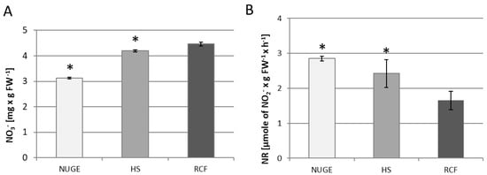 Tissue levels of nitrate ions and NR activity were determined in the cucumber leaves. Nitrate ions are the most important form of inorganic N that is taken up and assimilated by plants. They must be reduced through a two-step reduction to ammonium before incorporation into organic carbon skeletons to produce amino acids. NR located in the cytoplasm catalyzes the first step of nitrate reduction [35]. We found that the amount of tissue nitrate was significantly reduced in the leaves of NUGE-grown cucumbers and reached only 70% compared to the NO3− level in reference to RCF-grown plants, where the highest level of NO3− was observed. In plants growing on HS medium, the nitrate concentration in leaf tissue was also lower, approximately 10% compared to RCF plants (Figure 3A). At the same time, it was shown that NR activity reached the highest value in the leaves of plants growing on the NUGE medium. This accounted for approximately 172% of the NR activity detected in the leaves of the RFC-grown plants. NR activity measured in the leaves of HS-cultivated plants was also higher and reached 147%, compared to the enzyme activity in RCF-cultivated plants (Figure 3B).