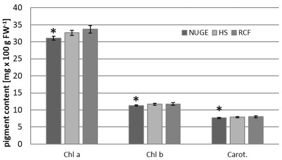 Photosynthetic apparatuses are highly sensitive to changes in the environmental conditions to which plants are subjected [36]. The composition of the growing medium based on urine and grey water, as well as other factors, including nutrient element deficiency and/or excess sodium ions, may affect photosynthetic activity in plants [7]. Therefore, the concentrations of photosynthetic pigments and chlorophyll fluorescence parameters were determined in the leaves of cucumber plants grown on NUGE, HS, and RCF media. It was found that the chlorophyll a content was slightly reduced in the leaves of NUGE- and HS-cultivated plants compared to Chl a in RCF leaves (Figure 4). The amounts of chlorophyll b and carotenoids in NUGE-grown plants were also slightly reduced compared to those in RCF plants.