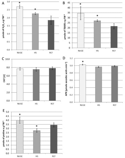 One of the indicators of oxidative stress in plant tissues is enhanced lipid peroxidation. It was found that the level of lipid peroxidation increased in the tested plants in parallel with the changes in the H2O2 content. The highest amounts of TBARS were shown in the leaves of the NUGE-cultivated plants. They achieved about 161% and 126% comparing to the leaves of RCF- and HS-nourished plants, respectively (Figure 5B).