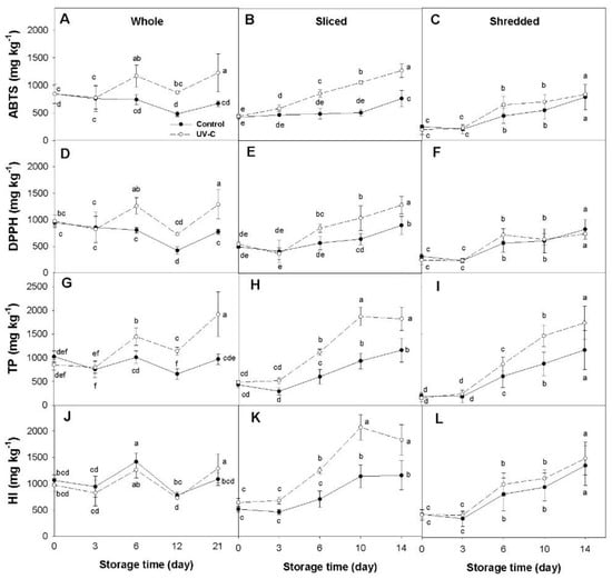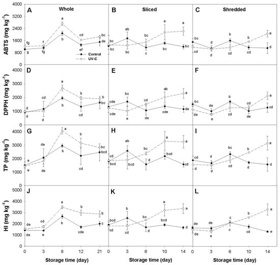 Time-course variation for mean antioxidant capacity determined by the ABTS (A–C) and DPPH (D–F) methods, concentration of total phenolics (TP) (G–I), and hydroxycinnamic index (HI) (J–L) values for whole (A,D,G,J), sliced (B,E,H,K), and shredded (C,F,I,L) root samples of the orange-rooted cultivar ‘Maestro’ during cold storage at 5 °C. Antioxidant capacity is expressed as mg Trolox equivalents per kg fw; and TP and HI as mg × kg−1 fw. Error bars represent standard deviation of the mean. Means not sharing a common letter are significantly different at p < 0.05, Fisher test.