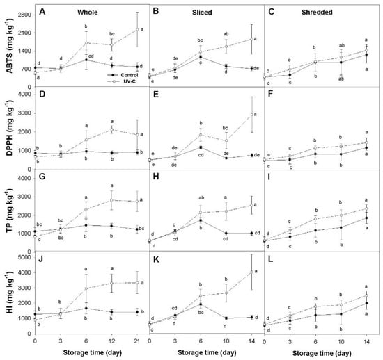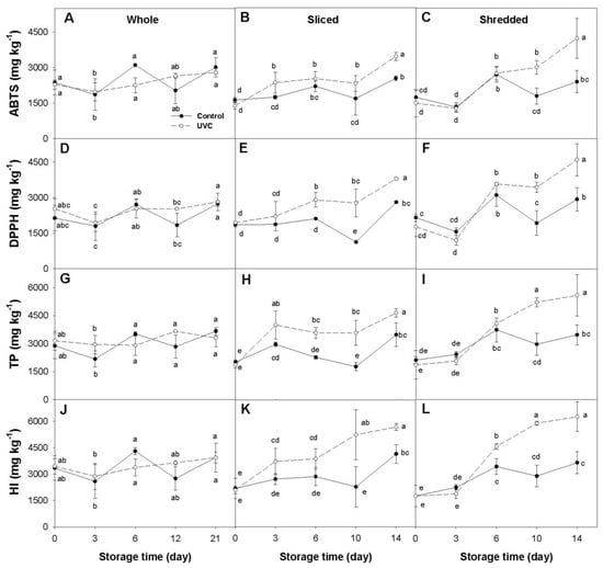 For shredded carrots, AOX, TP, and HI levels increased during cold storage in both control and UV-C treated samples relative to their basal values (day 0), but no significant differences were found between the two treatments (Figure 1C,F,I,L).