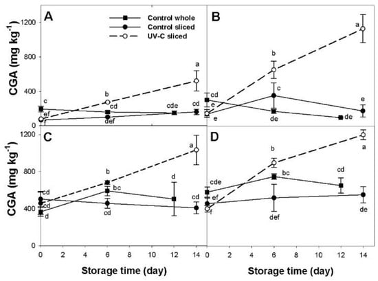 Time-course variation for chlorogenic acid (CGA) content in UV-C treated (- -○- -) and untreated (control) (-●-) sliced roots and in untreated whole roots (-■-) of the orange-rooted cultivar ‘Maestro’ (A), the yellow-rooted ‘Uzbek Golden’ (B), and the purple-rooted ‘Purplesnax’ (C) and ‘INTA44’ (D) during cold storage at 5 °C. Values are expressed as mg × kg−1 fw. Error bars represent standard deviation of the mean. Means not sharing a common letter are significantly different at p < 0.05, Fisher test.