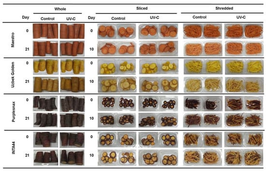 Appearance of UV-C treated and untreated (control) whole, sliced, and shredded root samples of orange (cv. Maestro), yellow (Uzbek Golden), and purple-rooted carrots (Purplesnax and INTA44), before the UVC treatment (day 0) and 10 (sliced roots) and 21 (whole roots) days after the UVC treatment and stored at 5 °C.