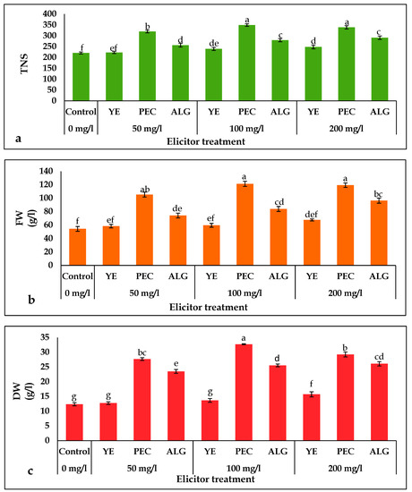 The cell or tissue biomass is one of the most critical aspects of in vitro propagation. Different elicitors have a substantial impact on cell or tissue growth and differentiation [34]. In order to prevent oxidative stress and cell death caused by excessive levels of elicitors, it is necessary to determine the optimal elicitor concentration [35]. In this study, all concentrations of elicitors significantly increased TNS, FW, and DW compared with the control (Figure 1). The applied elicitor treatments in the current study improved growth parameters because natural polysaccharides maintained turgor pressure within the cells and accelerated cell proliferation [36]. Cultures treated with 100 mg/L PEC showed the greatest increases in TNS, FW, and DW. Polysaccharide PEC is a vital component of the cell wall and stimulates many cell wall properties such as porosity, surface charge, ion balance, and lignin biosynthesis [37,38]. This means that the addition of PEC strengthens the cell wall, making them less permeable to pathogens. Therefore, PEC treatment resulted in better shoot growth and increased shoot weight. In a recent study by Haas et al. [39], pectin nanofilaments were found to regulate the shape of plant epidermal cells and to initiate morphogenesis. Previously, a positive effect of YE, PEC, and ALG on in vitro plant growth was demonstrated in many species [40,41].
