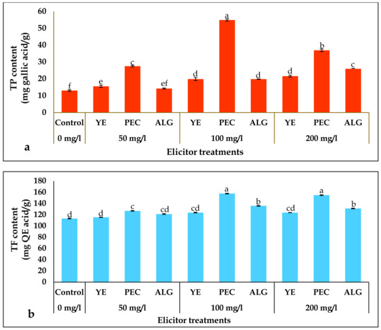 Effect of elicitor treatments on TP and TF contents in P. tuberosa shoots: (a) TP content (mg gallic acid/g), (b) TF content (mg QE acid/g). Note: Values are mean ± SD, means in a column followed by different letters are significantly different from each other at p < 0.05. Mean values followed by the same letter(s) in a column are not significantly different (p < 0.05) based on DMRT.