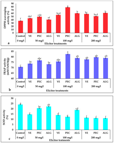 The three assays, DPPH (1,1-Diphenyl-2-picrylhydrazyl), FRAP (ferric reducing antioxidant potential), and SOD (superoxide dismutase), were used to estimate the antioxidant activity in P. tuberosa shoot culture extract after elicitation with 50, 100, and 200 mg/L of YE, PEC, and ALG (Figure 3). The DPPH and ferric radical scavenging potential of the shoot cultures significantly increased after treatment with all elicitor concentrations. The most pronounced increase in DPPH and ferric radical scavenging activity was observed in cultures treated with 100 mg/L PEC, which were 2.1-fold and 1.1-fold higher than the control cultures, respectively. The lowest increase in DPPH and FRAP activity was found in the 50 mg/L ALG treated cultures compared to other applied dosages of elicitors. In contrast, SOD activity in the culture decreased with increasing elicitor concentration. The highest SOD activity was 22.3% at a 50 mg/L concentration of ALG. The lowest SOD activity was detected at the highest concentration in all treatments (200 mg/L).