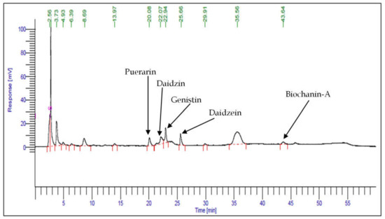 Pueraria tuberosa (Roxb. Ex Willd.) DC., known as “Kudzu”, belongs to the family Fabaceae and is native to South-East Asia. Kudzu is considered the most popular medicinal plant in traditional Chinese medicine and Ayurveda [1]. It has also received attention in modern pharmacopoeia due to the presence of numerous bioactive compounds, such as polyphenols, alkaloids, and phytosterols. Its tubers contain 49 different isoflavonoids. Of these, the five major isoflavonoids are puerarin, daidzin, genistin, daidzein, and biochanin-A [2]. Dietary intake of isoflavonoids has a major impact on human health, and they are capable of reducing osteoporosis risk, attenuating menopause symptoms, possessing anticancer, antidiabetic, anti-inflammatory, neuroprotective, wound healing, hypolipidemic, and nootropic properties [3,4].