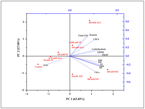 The effects of different elicitor treatments on physio-biochemical indices of P. tuberosa shoots were evaluated by principal component analysis (PCA). The components PC1 and PC2 explained 63.49% and 17.08% of the overall variance, respectively (Figure 5). The significant effects of the elicitor treatments on the studied attributes were clearly distributed along the PC1 axis in the order 100 mM PEC > 200 mM ALG > 200 mM PEC > 50 mM PEC > 100 mM ALG > 200 mM YE > 100 mM YE > 50 mM ALG > 50 mM YE > Control. PEC treatments scored significantly higher on PC1 and were clustered on the right side, whereas lower scoring treatments were clustered on the left side. PCA revealed better physio-biochemical indices in PEC treated shoots among all elicitor treatments tested. A loading matrix was used to determine the degree of correlation between physio-biochemical traits and a specific principal component (Table 2). PC1 demonstrated significant positive relationships and high loading conditions for all physio-biochemical parameters. PC2 exhibited significant positive relationships with physio-biochemical indices, but negative relationship were observed in terms of TNS, FW, DW, Chl a, TP, and TF contents.