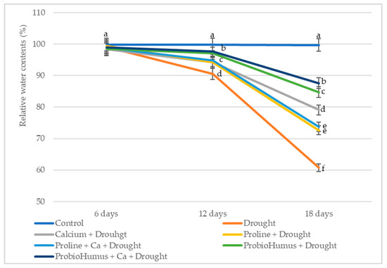 Differences in RWC of wheat leaves appear on drought day 12 (Figure 1). A reduction of 5–10% indicates that the plants experienced mild drought stress according to the standard of Hsiao [24]. After 18 days of drought stress, all treatments had positive effects on RWC leaves. Winter wheat plants exposed to ProbioHumus and ProbioHumus + Ca had the best retention of leaf water content, 82% and 88% (moderate stress), respectively, while the RWC of control (untreated) wheat leaves was 61% (high stress according to Hsiao standard). The leaf RWC of proline-treated wheat seedlings was close to the control.