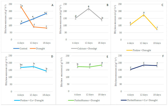 The effect of stress-protecting compounds application and prolonged drought stress (6, 12 and 18 days), on winter wheat ethylene emission level. Used types of application: (A)—water control and drought control; (B)—Ca + drought; (C)—proline + drought, (D)—proline + Ca + drought; (E)—ProbioHumus + drought; (F)—ProbioHumus + Ca + drought. Error bars represent the standard deviation of the mean. Different lowercase letters in the same day of drought indicate statistically significant difference (p < 0.05).