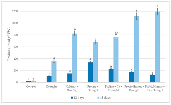 The amount of free endogenous proline in plants exposed to 12 days of drought stress was 10.58 µmol g−1 FW and after 18 days of drought increased to 35.61 µmol g−1 FW, wheal in control plants it was 2.23–2.74 µmol g−1 FW (Figure 3). After 12 days of drought, the highest amount of free proline was detected in the variant sprayed with proline 34.02 µmol g−1 FW. As the drought continued for 18 days, the highest concentration of proline was detected in ProbioHumus and ProbioHumus + Ca treated plants, 1117.5 and 1194.1 µmol g−1 FW, respectively. Analyzing the results of the study of the free proline content, it was observed that the proline content significantly increases as the drought period continues.