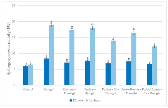The effect of stress-protecting compounds application and prolonged drought stress (12 and 18 days), on winter wheat H2O2 content. Error bars represent the standard deviation of the mean. Control, Ca, proline, proline + Ca, ProbioHumus, and ProbioHumus + Ca indicates the type of application. Different lowercase letters in the same day of drought indicate statistically significant differences (p < 0.05).