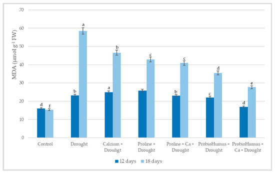 The effect of stress-protecting compounds application and prolonged drought stress (12 and 18 days) on winter wheat MDA content. Error bars represent the standard deviation of the mean. Control, Ca, proline, proline + Ca, ProbioHumus, and ProbioHumus + Ca indicates the type of application. Different lowercase letters in the same day of drought indicate statistically significant differences (p < 0.05).