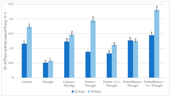 Drought significantly reduced winter wheat leaves’ PM ATPase activity. All studied stress-protecting compounds increased the PM ATPase activity of drought-exposed plants on average from 63% to 308% compared to untreated plants. The highest enzyme activity was recorded in ProbioHumus + Ca treated plants on the 12th and 18th day of drought: 0.1445 and 0.231 μmol Pi mg−1 protein h−1 respectively. Proline treatment stimulated plant PM ATPase activity by 172 and 260% on day 12 and 18 of drought, respectively as compared with control (Figure 6).