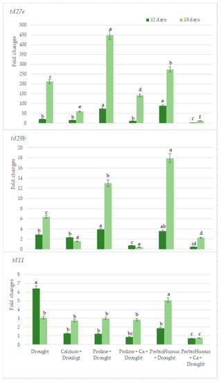 Quantitative results of RT-PCR analysis showed that among the 3 genes studied drought stress was most expressed in the td27e gene. The levels of td27e in the samples of plants treated with ProbioHumus + Ca are the lowest as compared with all tested variants (Figure 7). td29b gene expression levels were lower in Ca variants used both alone and together with proline and especially in combination with ProbioHumus and this was especially evident on the 18th day of the drought. The lowest levels of expression of td11 gene were recorded in the samples of plants exposed to ProbioHumus + Ca at both tested drought durations (Figure 7).