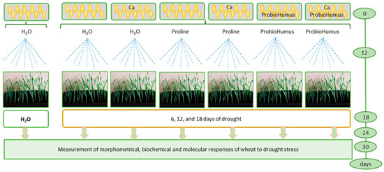 Twenty-one pot was used for the experiment: three for rational watering and eighteen for drought simulation. Stress-protecting compounds were added according to the scheme: (1) watered control, (2) drought control, (3) Ca plus drought, (4) proline plus drought, (5) proline plus Ca and drought, (6) ProbioHumus and drought, (7) ProbioHumus plus Ca and drought (Figure 8).