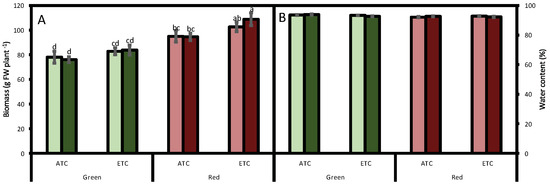 Effect of A. alternata inoculum and environmental conditions on the fresh biomass (A) and water content (B) of two differently-colored fresh lettuces. Light green bars represent green fresh lettuces grown without inoculum (Aa−), dark green bars represent green fresh lettuces grown with inoculum (Aa+), light red bars represent red fresh lettuces grown without inoculum (Aa−), and dark red bars represent red fresh lettuces grown with inoculum (Aa+). (ATC) refers to lettuces grown under the present climatic scenario and (ETC) to those grown under a climate change scenario. Each value represents the mean ± standard error (n = 8). Significant differences (p < 0.05) are indicated by different letters.