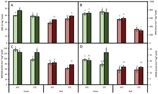 Effect of A. alternata inoculum and environmental conditions on the superoxide dismutase (SOD, (A)), ascorbate peroxidase (APX, (B)), monodehydroascorbate reductase (MDHAR, (C)), and dehydroascorbate reductase (DHAR, (D)) activities of two differently-colored fresh lettuces. Light green bars represent green fresh lettuces grown without inoculum (Aa−), dark green bars represent green fresh lettuces grown with inoculum (Aa+), light red bars represent red fresh lettuces grown without inoculum (Aa−), and dark red bars represent red fresh lettuces grown with inoculum (Aa+). (ATC) refers to lettuces grown under the present climatic scenario and (ETC) to those grown under a climate change scenario. Each value represents mean ± standard error (n = 4). Significant differences (p < 0.05) are indicated by different letters.