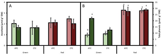 Effect of A. alternata inoculum and environmental conditions on ascorbate (A) and total phenols (B) of two differently-colored fresh lettuces. Light green bars represent green fresh lettuces grown without inoculum (Aa−), dark green bars represent green fresh lettuces grown with inoculum (Aa+), light red bars represent red fresh lettuces grown without inoculum (Aa−), and dark red bars represent red fresh lettuces grown with inoculum (Aa+). (ATC) refers to lettuces grown under the present climatic scenario and (ETC) to those grown under a climate change scenario. Each value represents mean ± standard error (n = 4). Significant differences (p < 0.05) are indicated by different letters.