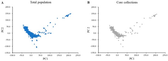 Principal component analysis of the total population and core collection with 180 K Axiom® SoyaSNP. (A) Blue indicates the total wild soybean accessions (n = 1467). (B) Gray represents 408 selected core collections.