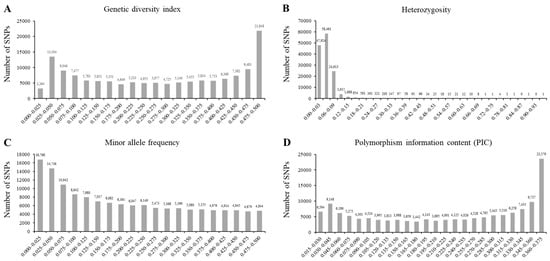 The 180 K single-nucleotide polymorphism (SNP) markers were used to evaluate the genetic diversity indices of the wild soybean collection. The genetic diversity index ranged from 0.022 to 0.500. The mean of the genetic diversity index was 0.272 (Figure 2A). Approximately 97.8% of the analyzed SNP markers showed a heterozygosity value of <0.09 (Figure 2B). The minor allele frequencies ranged from 0.011 to 0.555, and the mean value was 0.197 (Figure 2C). The polymorphism information content (PIC) indicated the allelic diversity of the evaluated SNP markers (Figure 2D). The maximum and minimum PIC values were 0.375 and 0.022, respectively, with an average of 0.222. According to the analysis of the genetic diversity indices in this study, 119 SNPs across 20 chromosomes showed the highest diversity among the 180 K SNP genotypes.