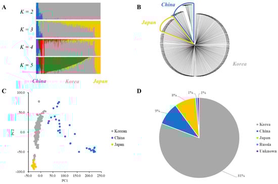 Cluster analyses and a phylogenetic tree of 408 wild soybean accessions of the core subset. (A) The admixture plot. Clustering of K values from 2 to 5 for wild soybean core collections. Each wild soybean accession is shown on a vertical bar, representing the proportion of the genome of the wild soybean accession from the clusters. (B) Unweighted pair group method with arithmetic mean (UPGMA) phylogenetic tree of 408 wild soybean accessions. Blue represents the Chinese wild soybean, and yellow represents the Japanese wild soybean collections. (C) Principal components of SNP variation. The Korean, Chinese, and Japanese clusters are indicated in gray, blue, and yellow, respectively. (D) Distribution of three clusters in the core subset.