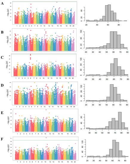 Manhattan plots of CMLM analysis and phenotypic distribution for days to flowering with 408 wild soybean accessions in 5 different environments. (A) Suwon, 2012. (B) Suwon, 2013. (C) Gwangju, 2016. (D) Jeonju, 2016. (E) Ochang, 2016. (F) The mean of five environments. The horizontal green line indicates the genome-wide significance threshold based on Bonferroni correction (p < 0.05).