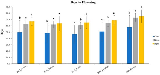 Phenotypic distribution for days to flowering with 408 core collections in 5 environments. The Korean, Chinese, and Japanese clusters are indicated in gray, blue, and yellow, respectively. Bars indicate standard deviation. LSD is the least square difference between clusters in five different environments, and different characters on bars indicate 5% significance level.