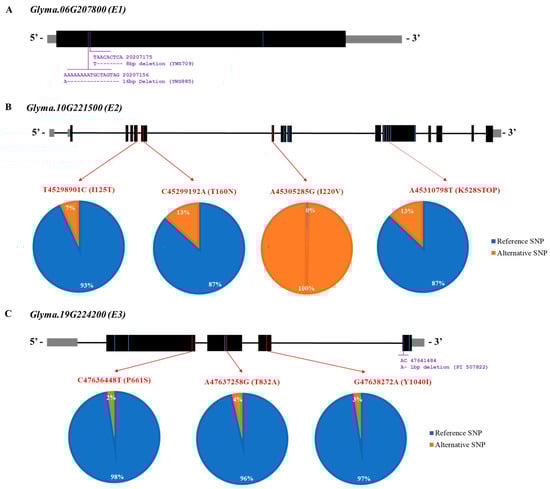 Gene structures of E1, E2, and E3 are shown with their variants of sequenced wild soybean accessions. (A) Gene model of Glyma.06G207800 (E1), where black boxes indicate exon regions, gray boxes indicate the untranslated region, and black lines indicate the intron region. Blue color indicates a silent mutation of E1. (B) Gene model of Glyma.10G221500 (E2), where black boxes indicate exon regions, gray boxes indicate the untranslated region, and black lines indicate the intron region. Missense and nonsense mutations in the exon regions are marked with red lines. Blue indicates a silent mutation of E2. The reference SNP indicates the Glycine max Wm82.a2 reference genome. The pie charts indicate the proportion of reference and alternative SNPs for missense and nonsense mutations. Blue color indicates the reference SNP which is W82.a2.v1, while orange color indicates the alterative SNP which is different from SNP of Williams 82 (C) Gene model of Glyma.19G224200 (E3), where black boxes indicate exon regions, gray boxes indicate the untranslated region, and black lines indicate the intron region. Missense mutations in the exon regions are marked with red lines. Blue indicates a silent mutation of E3. The proportions of reference and alternative SNPs are shown in pie charts. Blue color indicates the reference SNP which is W82.a2.v1, while orange color indicates the alterative SNP which is different from SNP of Williams 82.